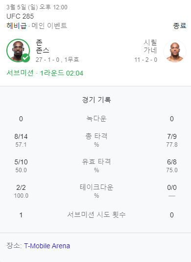 UFC 285 역대급 선수로 평가받는 최연소 챔피언, 무패의 사나이 존존스, 그에 걸맞는 상대라 생각했던 시릴간 헤비급 빅매치가 아주 허무하게 끝나 버렸습니다. 소문난 맛집에 이런...