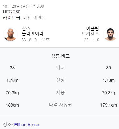 10월 23일(일) UFC 280 메인 이벤트로 라이트급 찰스 올리베이라 VS 이슬람 마카체프 경기가 있습니다.