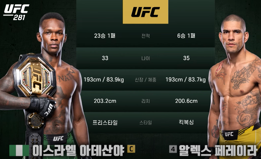 키가 무려 193이고 리치가 약간 아데산야가 길긴 하지만 페레이라도 만만치 않습니다. 무려 193인 사람들이 그렇게 빠르게 움직인다니 놀랍기만 한데요,, 우선 아데산야의 피지컬이야 뭐 이미 유명하고 피지컬을 기반으로 한 그의 약간 얍삽한 스타일로(오늘 경기는 매우 영리했음) 미들급을 정리 해버렸으니 말할것도 없었습니다